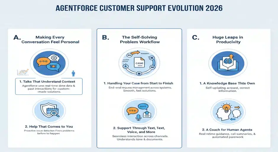 Agentforce isn’t stuck in a little chat box. By 2026, it will work smoothly with voice calls, understand documents you upload, and even pick up on your tone of voice. This ability to interact in many ways makes support easier to access and deepens the impact of the Agentforce customer support evolution.