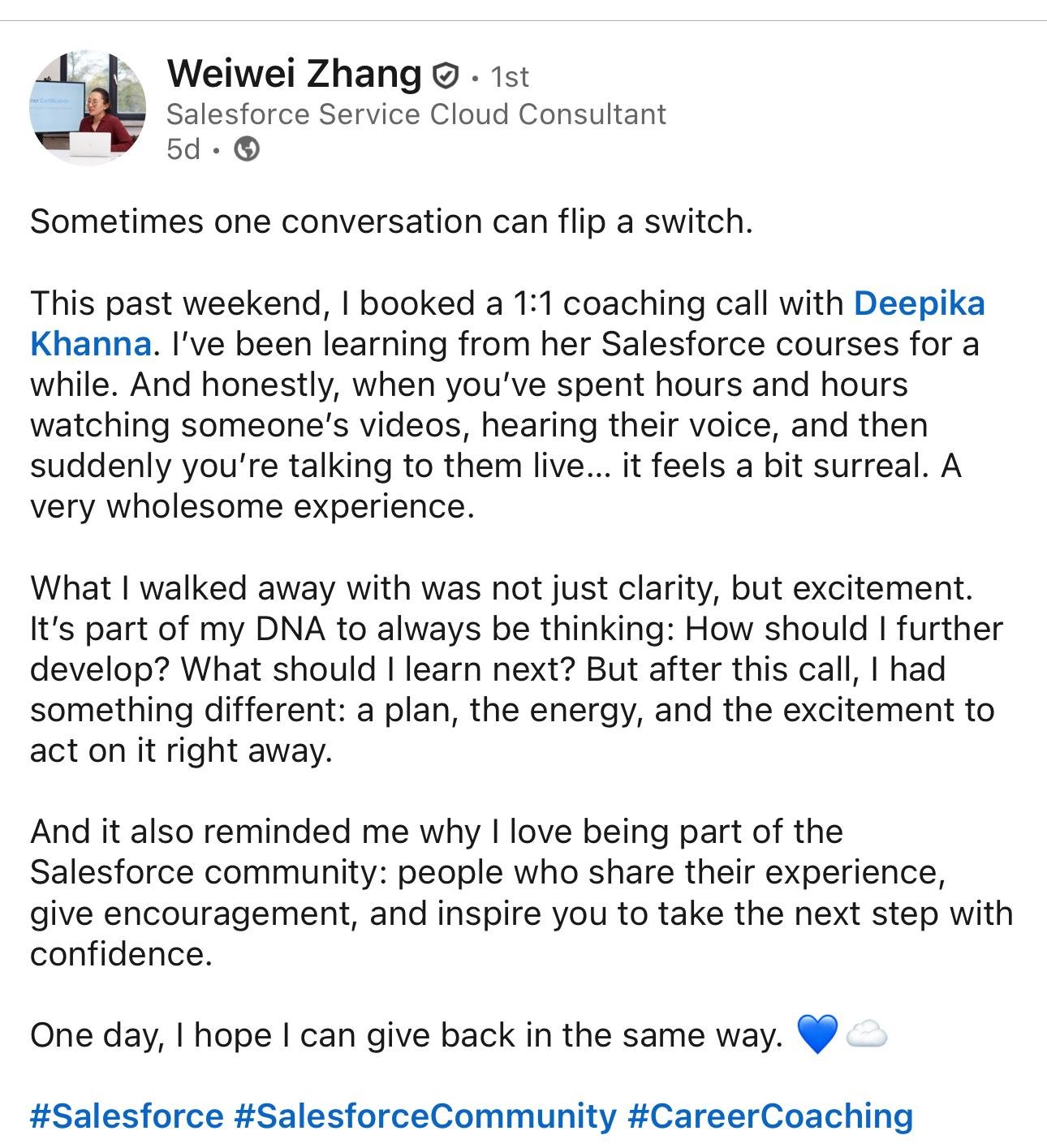 Hi! I’m Deepika — a Salesforce instructor, mentor, and career coach who’s helped over 200,000 students learn Salesforce through MyTutorialRack and Udemy. I started just like many of my students: unsure, nervous, but determined. I believe in gentle guidance, practical steps, and celebrating every small win.