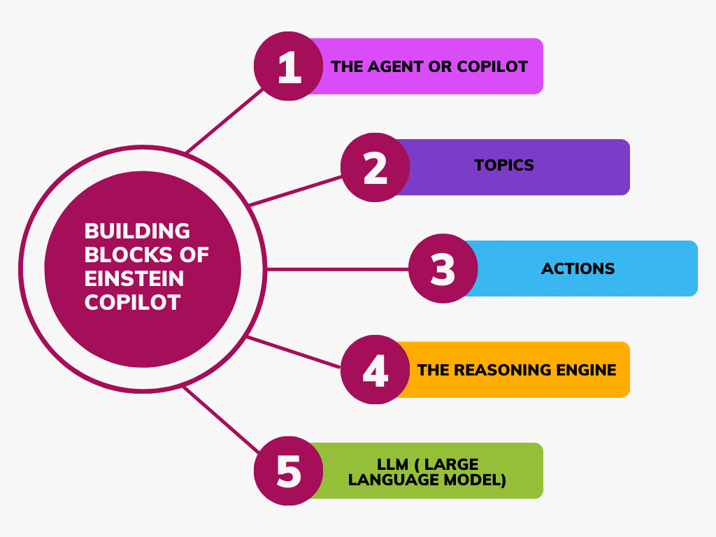 Agents and Copilot have five components: the agent or copilot, topics, actions, the reasoning engine, and the large language model (LLM).