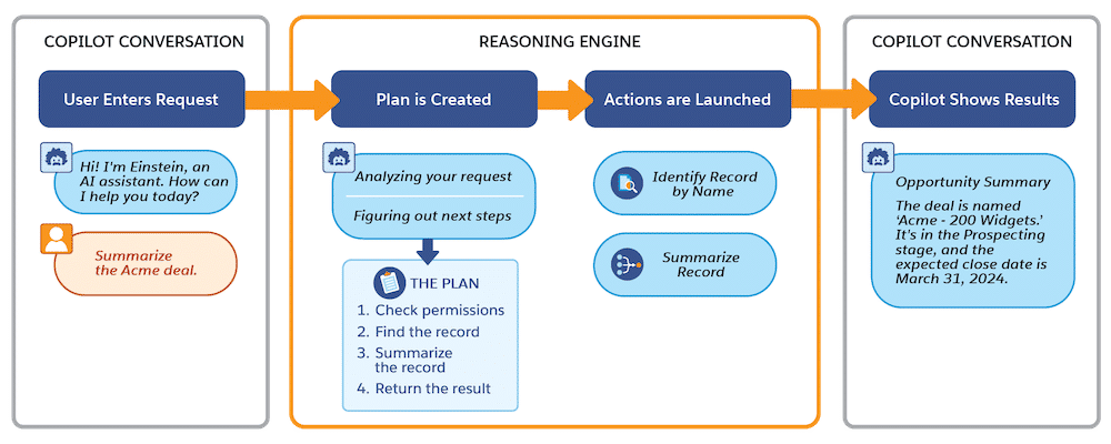 The Einstein Copilot reasoning engine, known as the planner service, manages how it launches topics and actions during a conversation to complete a task for the user.