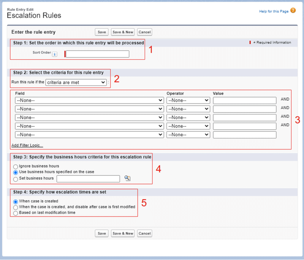 Escalation actions specify the duration of case escalation and the steps that follow every rule entry; you can add up to five actions to escalate the case over longer timeframes. Let’s examine each of these and how they appear within Salesforce.