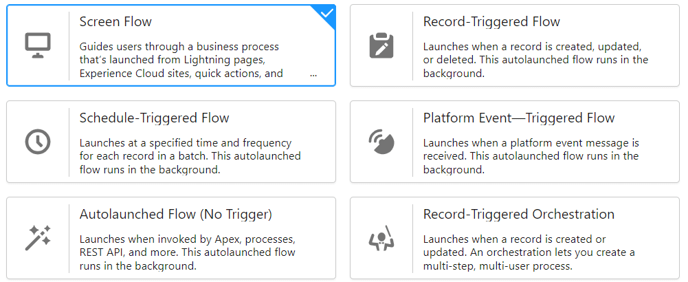 Use this flow type for automated tasks. Autolaunched flows can be triggered from other flows (subflows), Apex classes, scheduled times, record changes, or platform events.