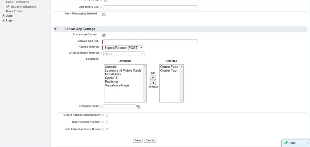 Publisher: The Chatter publisher and action bar display the canvas application. If you choose this option, you also need to make a custom action for Canvas and add it to the page layout of an object or the global publisher layout.