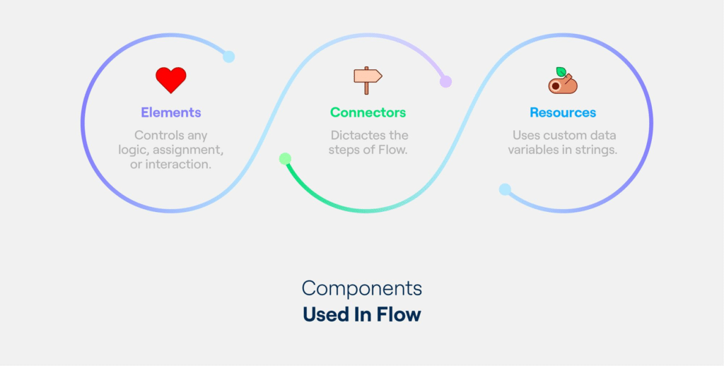 Salesforce Flows are created by combining resources, connectors, and elements. These are the tools found in Salesforce Flows.