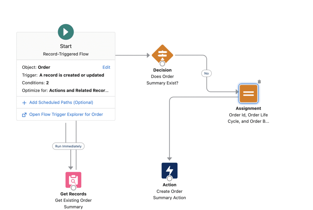 - Start Element: The flow’s beginning is represented by the Start element. The elements in the flow are carried out sequentially after the Start element. You must set the Start element in Record-Triggered, and Schedule-Triggered flows to the desired start time for the flow.