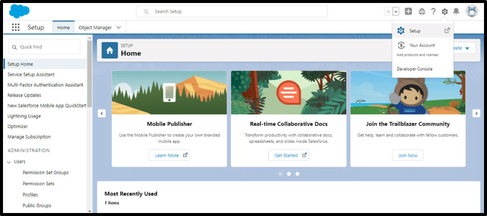 Step 1: As seen in the image below, we must first navigate to “setup,” which is located in the upper right corner of the screen next to the notification icon, to determine the role’s location. Select “Setup” by clicking.